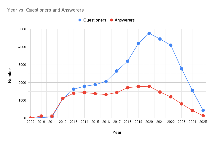 Analyzing StackOverflow data (2008–2026) reveals a massive activity decline post-ChatGPT. Using Google Apps Script as a case study, this report quantifies the migration from human support to AI. We explore how the platform is pivoting from a help desk to a critical verification layer for AI-generated code to prevent model collapse.