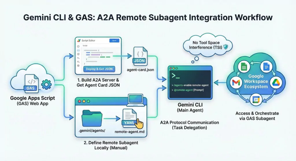 In his post, Tanaike-san demonstrates how to bridge the gap between a local environment and remote script functions. By deploying an Apps Script as a web app, it can act as a “remote subagent” that the Gemini CLI calls to perform actions within Google Workspace or process data using the Apps Script environment.
