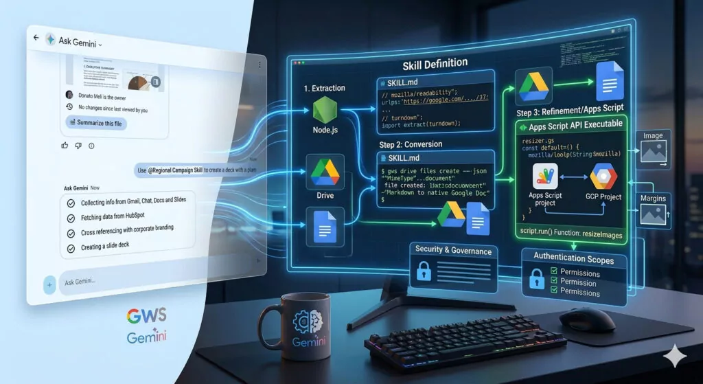 In this post, I will provide an overview of the gws tool and explain how it differs from the Gemini CLI Workspace Extensions. More importantly, we will examine the modular architecture of “Skills”, “Recipes” and “Personas” that makes this tool in my view a masterpiece in modern, role-based automation.